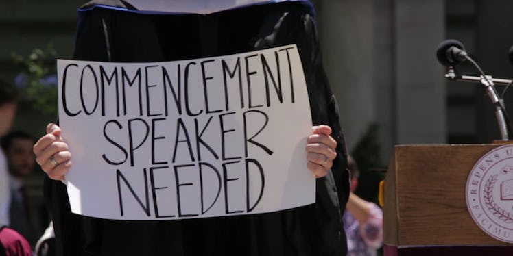 One group, Improv Everywhere, is so determined to mess with the minds of unsuspecting individuals that they put on a fake graduation and asked random strangers to be guest speakers. In a YouTube video of their stunt (posted above), you can see one of the improvisers asking people if they'd like to speak while holding a sign that reads "Commencement Speaker Needed."