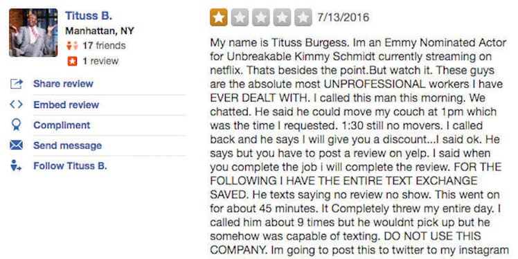 There is nothing better than a famous person calmly explaining who they are in a Yelp review before eviscerating a company. Also, please pay special attention to the hashtag game here, because it is amazing.