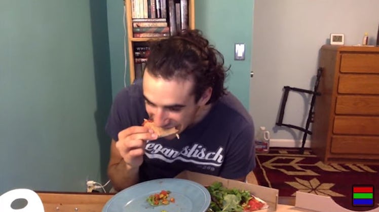 Basically, this guy posts long videos about the vegan lifestyle and recipes etc..., and in this specific video, he is busy eating a pizza (that his mom got him) when he starts to realize there might be cheese in it.