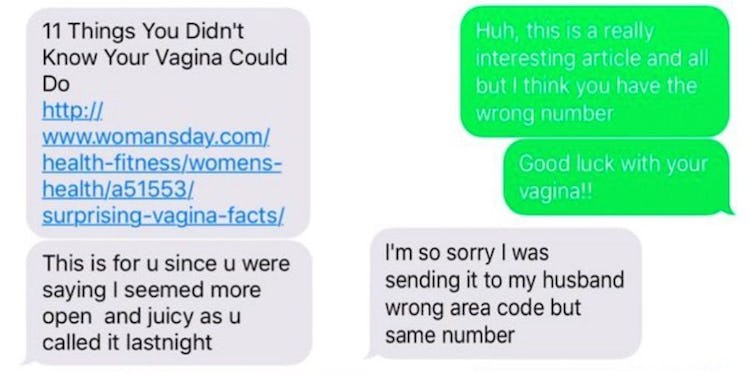Internet, how many times do I need to go over this? You gotta double check the number if you’re going to send a risqué text message to a significant other, especially when that text involves you talking about your "juicy" vagina.