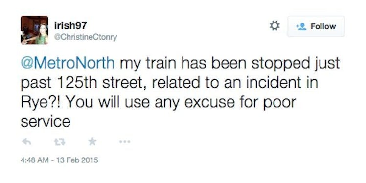 In the past year, @ChristineCtonry has tweeted 132 times, which would be fairly unremarkable if you ignored the fact that nearly every single one of those tweets consisted of her complaining to Metro North about her commute to and from Connecticut.