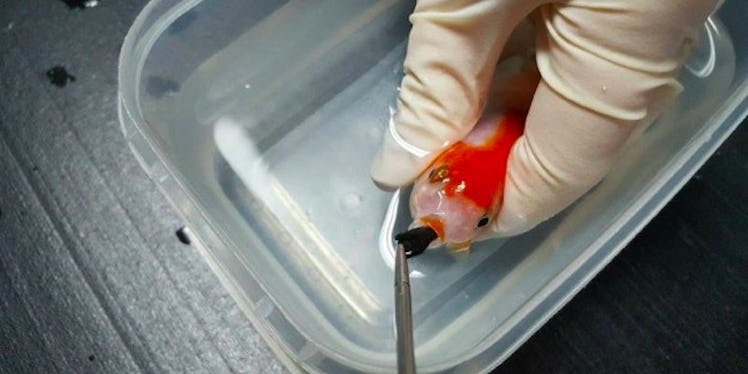 The Ranchu Goldfish had the pebble lodged in the back of its throat. Now, it was time for some vets to help this little guy out.