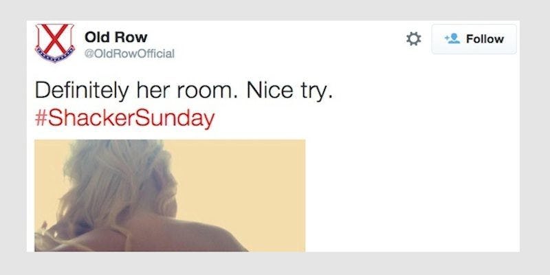 In addition to the party culture that Old Row promotes, images of half-naked women with hashtags like #ShackerSunday and #ThongThursday are blasted to the account’s 100,000-plus followers.