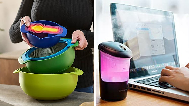 If your kitchen drawers are maxed out with pots and pans cluttering every surface, this super compact nesting bowl set will change your life. The amazingly space-efficient bowl set manages to fit nine separate items into a small 10.5 square inch area. The pieces include two mixing bowls, a colander, a steel sieve strainer, and five measuring cups. They all have non-slip bottoms, and all but the sieve are dishwasher-safe.