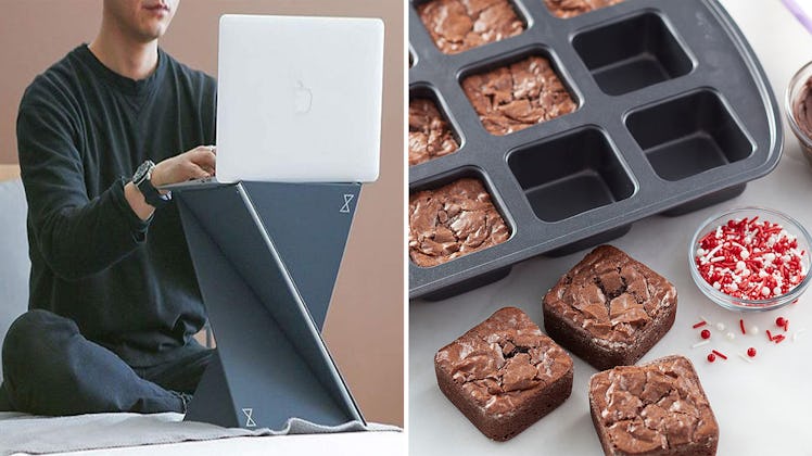Stack it on top of your work space to create a standing desk, or use this laptop stand to binge movies in bed. The height is adjustable and it doubles as a cooling stand — plus it even has two foldable phone holders.