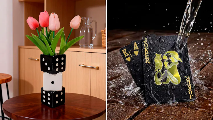 Whether you’re at home, by the pool, or outside with drinks, a regular deck of playing cards can get ruined pretty quickly. These waterproof playing cards are made from sturdy plastic that resists bending, sticking, and wear, even after lots of shuffling and repeat use. The smooth finish makes them easy to handle and the clean design with a geometric back pattern gives them a sleek, modern look.