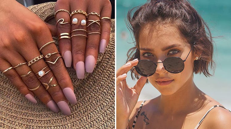 Layer on this 10-pack of gold or silver plated stacking rings that work together no matter how you stack them. The mixed pack includes a few knuckle rings, adjustable rings, and even a statement pearl ring. They come with a black carrying bag to keep them all together when you travel.