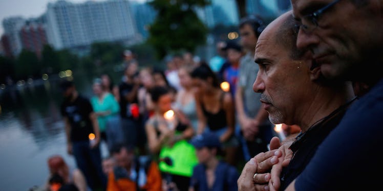 During a vigil for the victims of the Orlando shooting massacre, as the names of the 49 people who were murdered were read aloud in remembrance, a photographer turned her camera to the sky and took a picture of a flock of birds flying overhead.
