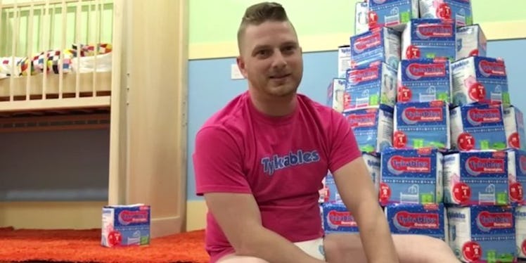 Yup, that's a grown man in a crop top and diapers walking around a store filled with high chairs and cribs made for adults. This is really a thing that is happening.