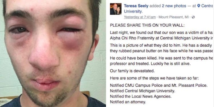 The teen was left unrecognizable by the brutal hazing at Central Michigan University, which was exposed by his mom in a Facebook post on Wednesday.