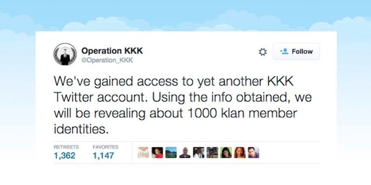 We've gained access to yet another KKK Twitter account. Using the info obtained, we will be revealing about 1000 klan member identities. — Operation KKK (@Operation_KKK) October 22, 2015