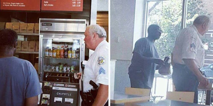 Case in point: Earlier this week, a Chicago cop was taking his lunch break at a local Chipotle when he saw a homeless man digging through the trash cans outside, looking for food.