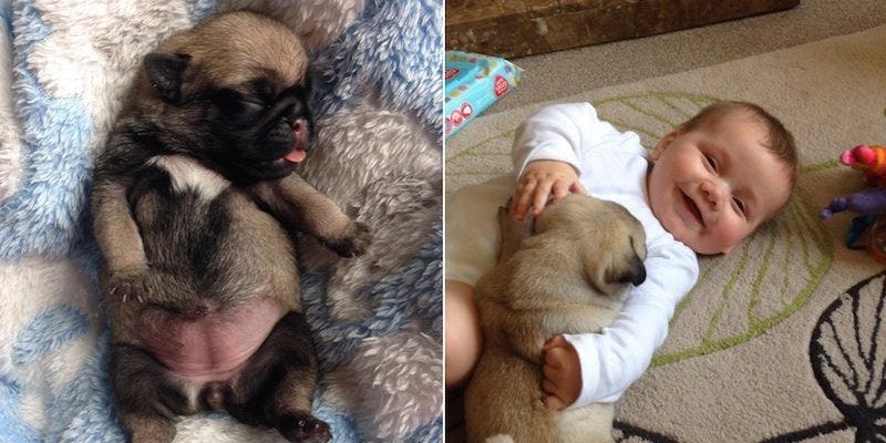 Alone, both puppies and babies are enough to incite cute explosions, but together, they're almost too much to handle.