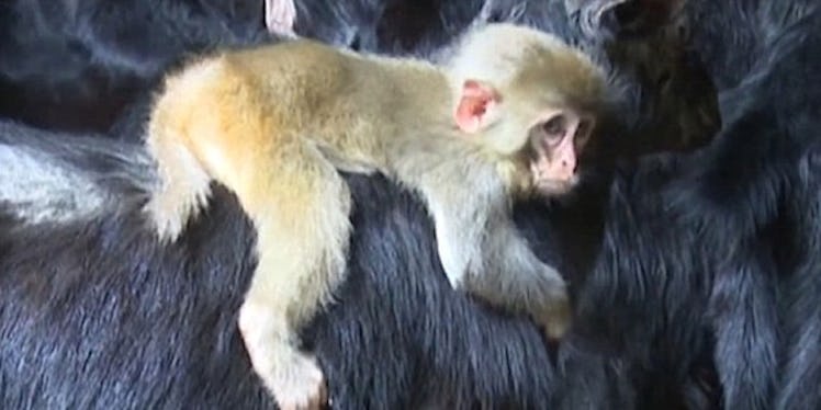 The little 6-pound monkey, who was frightened at the sight of the farmer, decided to cling onto the backs of goats in the pen for protection. Can you even blame this little guy?
