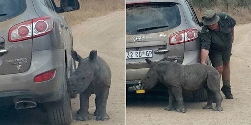 Citations: Orphaned baby rhino thinks this jeep is his new mum – all the tears (Metro)