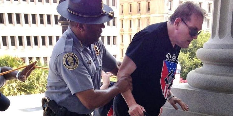 The picture was taken as the Ku Klux Klan protested the removal of the Confederate flag from outside of the South Carolina State House.