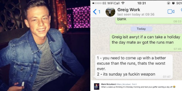 The 20-year-old was feeling so rough, he hit up his boss Greig on WhatsApp to tell him he couldn't make it in for his job in landscape gardening.