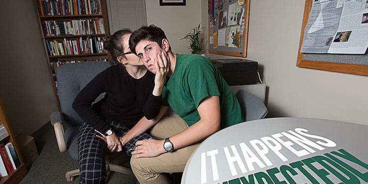 Many of the photos in the series show two people engaging in unwanted sexual situations, with the victim looking right at the camera along with statements about how it (sexual assault) happens.