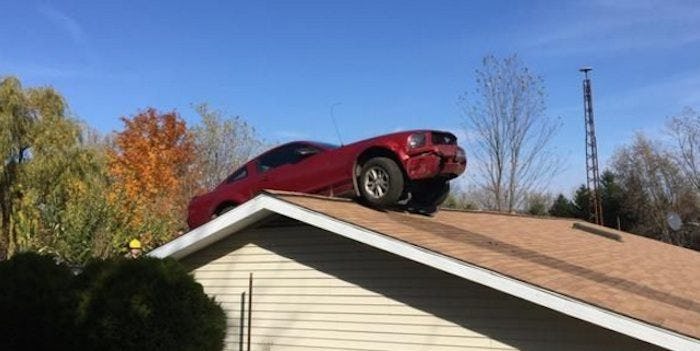 Citations: Owner Hears 'Kaboom,' Finds Car on Roof of Michigan Home (ABC News), No, you may not park your Ford Mustang on the roof of this house (The Washington Post)