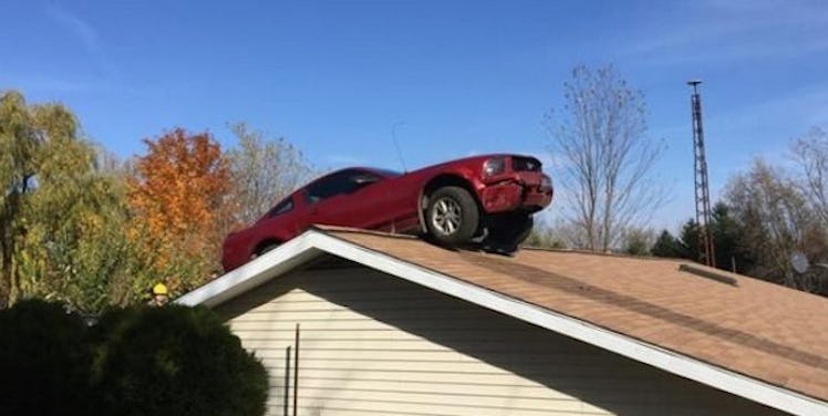 A Michigan driver crashed his car onto the roof of a house after he lost control of his Mustang on I-69 pic.twitter.com/wduAk0zBIE — Mojo In The Morning (@MojoInTheMorn) October 28, 2015