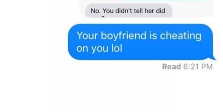 Normally, I'd be offended by my friend being insensitive enough to "lol" at the fact that my boyfriend was cheating on me but, no, this was really truly lol-worthy. Like, "Hey, your boyfriend did cheat on you but actually it's totally fine because I already got revenge for you and he's a total idiot and you win because you have great friends like me... LET'S LOL ABOUT IT."