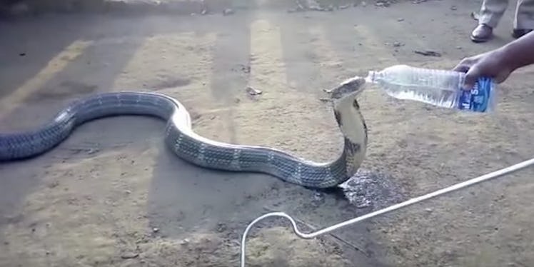 With New Dehli experiencing a lengthy drought, the cobra had been spotted slithering around a village looking for water. It wasn't until a generous rescue worker with a water bottle came along that the cobra was able to escape death.
