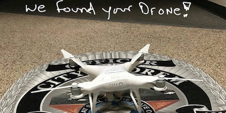 The drone was initially brought to the attention of the police by a man who spotted the device flying outside of his window, then followed the flying object until it landed in a church parking lot.