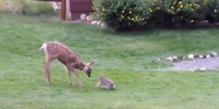 In the world of adorable Internet animals, a fawn and a rabbit are inadvertently reenacting everyone's favorite scenes from "Bambi."