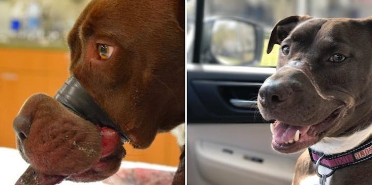 The vile 2015 incident left the dog's face swollen and turned her tongue black due to the severe lack of blood circulation.