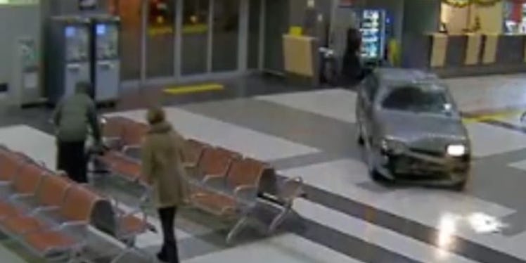 Yep, the driver smashes through another glass wall and drives through another concourse in the airport before plowing through an exit to the outside world.