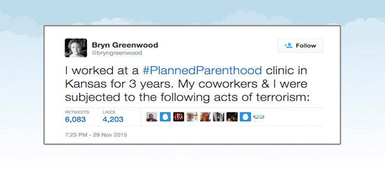 The goal was to make us afraid to come to work, to make us quit, to make us close the clinic. That's terrorism. That's how terrorism works. — Bryn Greenwood (@bryngreenwood) November 30, 2015