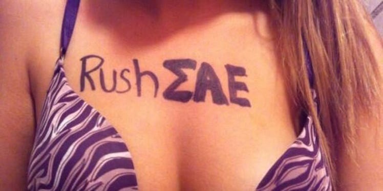 A college student apparently saw nothing wrong with asking a fellow student he barely knew to take a picture of her bare breasts with the name of his fraternity written on them.