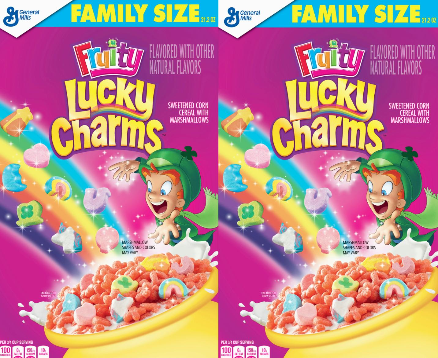 Fruity Lucky Charms is sold in a magenta box and features Lucky the Leprechaun's iconic cereal-and-marshmallow filled pot of gold at the end of the rainbow. Though you'll still get your classic rainbow, shooting star, and heart-shaped marshmallows in every box, the cereal itself will be a little different. Fruity Lucky Charms are updated to be, well, fruity! Your bowl might look a little brighter too, since the cereal is a bright red instead of the classic brown. Though no fruit is specified, you could guess that the cereal is meant to taste like some kind of berry or cherry due to its reddish-pink color.