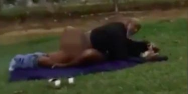 The footage shows a man hunched over a woman with his pants pulled down to his ankles. They're lying on a blanket in the middle of the grass.