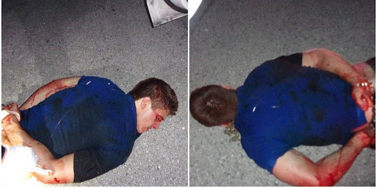 The shocking pictures show Harrouff lying on the ground covered in blood. He is handcuffed.