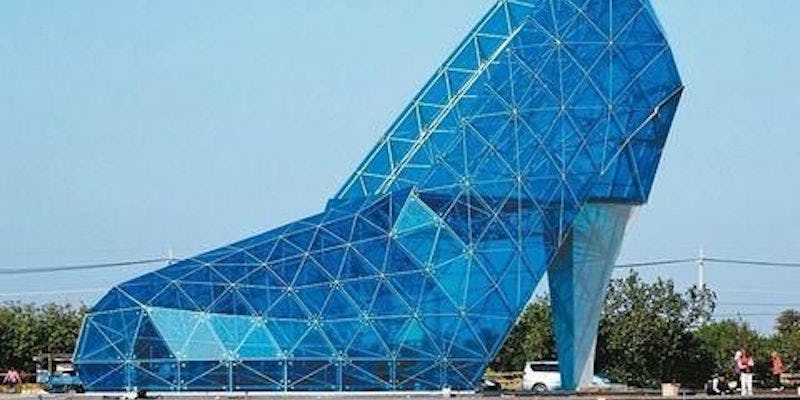 Or, to be precise, a giant high-heel. That's the idea in Taiwan anyway, where the 55-foot structure was constructed out of 322 pieces of blue glass by the Southwest Coast National Scenic Area.