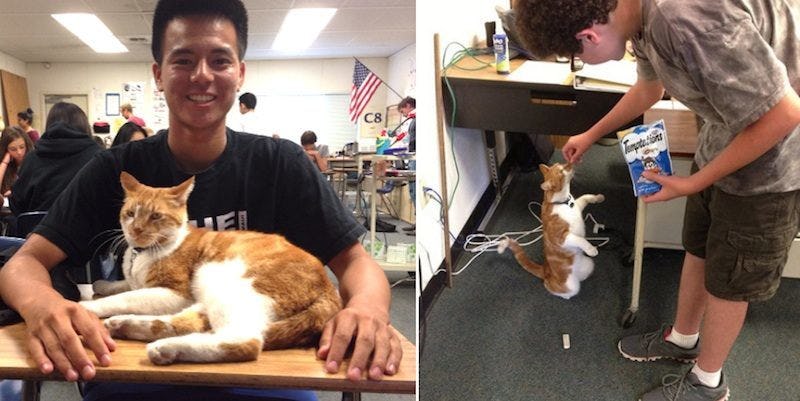 The cat's owner, Amber Marienthal, whose sons attend Leland High School, doesn't have a problem with Bubba being allowed to roam the school, though she does fear he is in some danger.