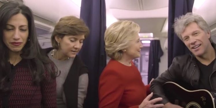 Shortly after, the camera pans onto Hillary Clinton, who stood still while gazing at Bon Jovi, who was frozen with his acoustic guitar in his arms.
