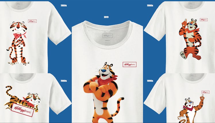 It's no secret that adulting is hard, and I'm so here for Kellogg's throwing it back to a simpler time by launching a new capsule t-shirt collection. Starting on Thursday, March 7, which happens to be National Cereal Day, the brand is offering t-shirts featuring seven different Tony designs to show how the tiger has changed over the years. From the 1950s to the present day, each white top features a red Kellogg's NYC logo and that decade's iteration of Tony the Tiger. Considering that Kellogg's has been around for 113 years now, the cereal company definitely knows how to do nostalgic merchandise justice. The beloved cat has been around since the very beginning of Frosted Flakes, but he's had quite a few makeovers since then.