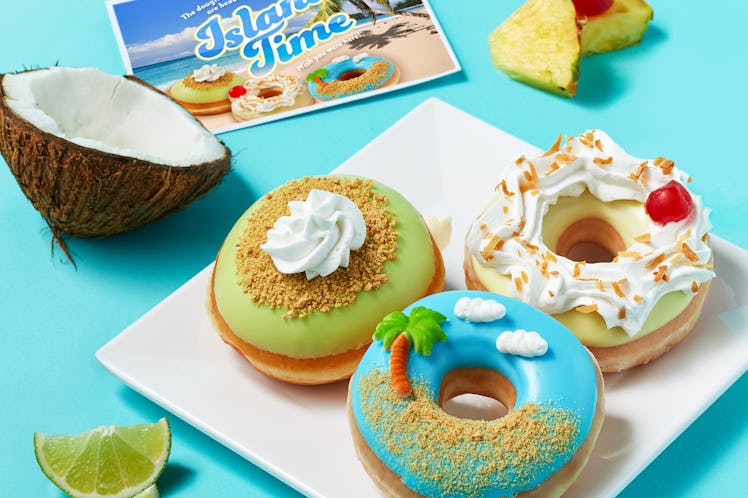 It’s time to get into pre-summer mode with some super tropical doughnuts at Krispy Kreme. The chain dropped its new Island Time Collection on May 17, which features colorful doughnuts inspired by piña coladas and key lime pie that sound good enough to sip. Get ready for a flavor vacation, because Krispy Kreme's Island Time Doughnut Collection is filled with tropical flavor.
