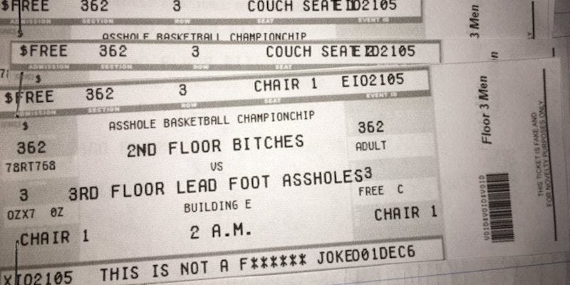 Along with their note, her neighbors created fake tickets to a "basketball game" in their apartment and assigned everyone "couch seats" in "Building E."