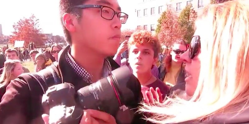 One male student says, "You don't have a right to take our photos," to which Tai responds by citing his First Amendment rights.