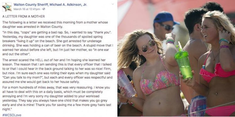 A mom penned a thank you note to a Florida police officer after he arrested her daughter for underage drinking during spring break.