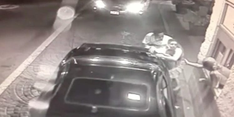 Just when the toddler is in the arms of the both the mother and the employee, Crossty grabbed her, got into the car and drove away.