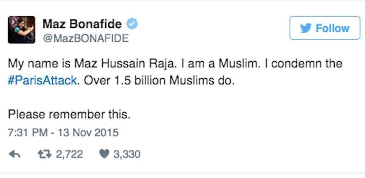 My name is Maz Hussain Raja. I am a Muslim. I condemn the #ParisAttack. Over 1.5 billion Muslims do. Please remember this. — Maz Bonafide (@MazBONAFIDE) November 14, 2015