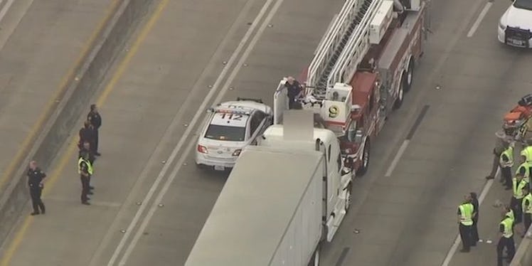 The former accident was the reason traffic remained still before the woman climbed onto the truck, which was heading west, ABC 13 reports.