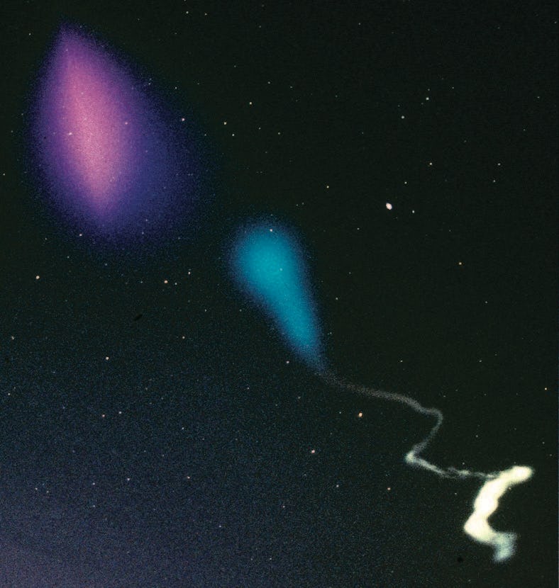 About six minutes after the suborbital rocket's launch, NASA says it will deploy "four sub-payloads containing mixtures of barium and strontium," creating glowing clouds that are blue-green and red in color.