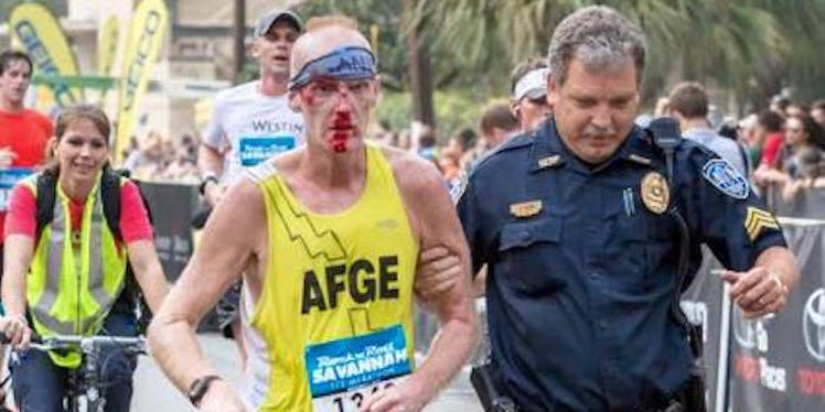SCMPD Sgt. John Cain helped this Rock n' Roll marathon runner across the finish line after he fell. #WhyIWearTheBadgeThank you Casey Jones for this photo! #RnRSAV #VisitSavannah Posted by Savannah-Chatham Metropolitan Police Department on Saturday, November 7, 2015