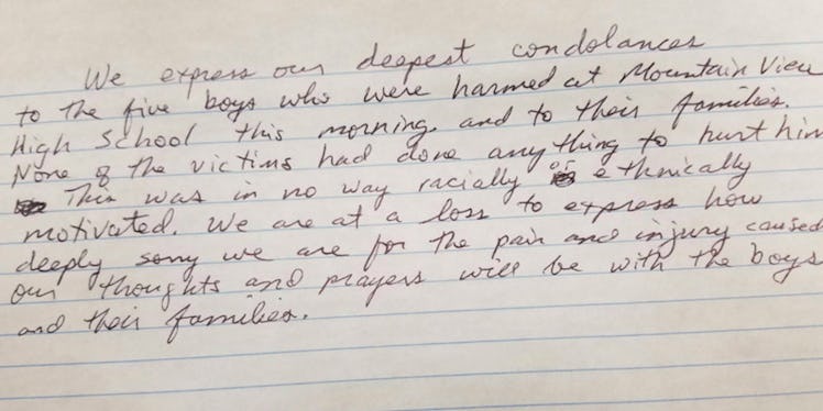 We express our deepest condolences to the five boys who were harmed at Mountain View High School this morning and to their families. None of the victims had done anything to harm him. This was in no way racially or ethnically motivated. We are at a loss to explain how deeply sorry we are for the pain and injury caused. Our thoughts and prayers will be with the boys and their families.