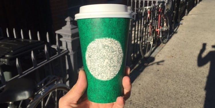 The cup, which is green and white in color, features a "mosaic of more than a hundred people drawn in one continuous stroke," according to Buzzfeed News.